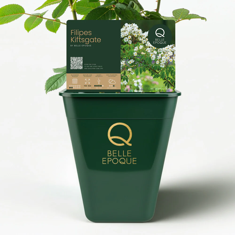 De overvloed aan kleine, roomwitte bloemen verschijnt in juli en augustus en vormt samen met het gezonde, mediumgroene blad een spectaculair geheel. De bloemen verspreiden een sterke, zoete geur die je tuin verandert in een paradijselijke oase. Dankzij de robuuste groei en de stevige, stekelige takken is Filipes Kiftsgate een betrouwbare rambler voor grote tuinen en landschappen.