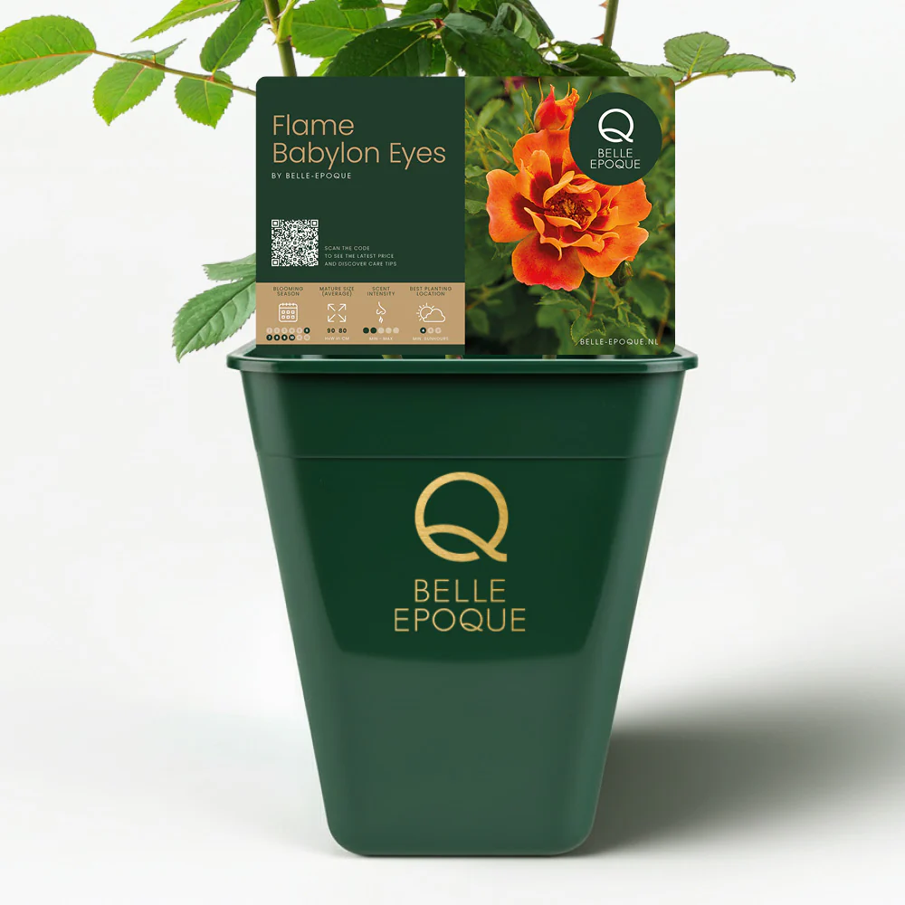 De Flame Babylon Eyes is een opvallende Perzische struikroos die warmte en levendigheid in de tuin brengt. De bloemen tonen een speelse mix van gele en oranje tinten, versterkt door het karakteristieke donkerrode ‘oog’ in het hart van de bloem. Dit bijzondere kleurenspel maakt Flame Babylon Eyes een echte blikvanger in borders of als solitaire struik.