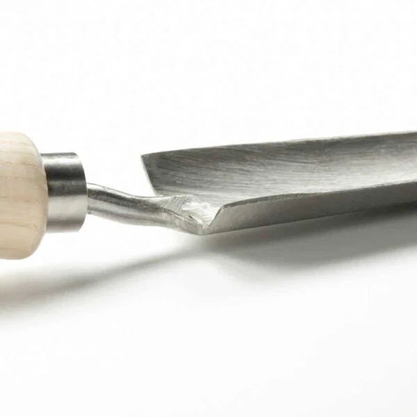 Het scherpe, handgesmede blad dringt gemakkelijk door kleiige of compacte grond, waardoor het ideaal is voor het maken van plantgaten, het verplanten van zaailingen en het doorsnijden van wortels. Het blad is iets gebogen, zodat het meer aarde vasthoudt en je nauwkeuriger kunt werken. Het ergonomische houten handvat zorgt voor een comfortabele grip en optimale krachtsoverdracht.